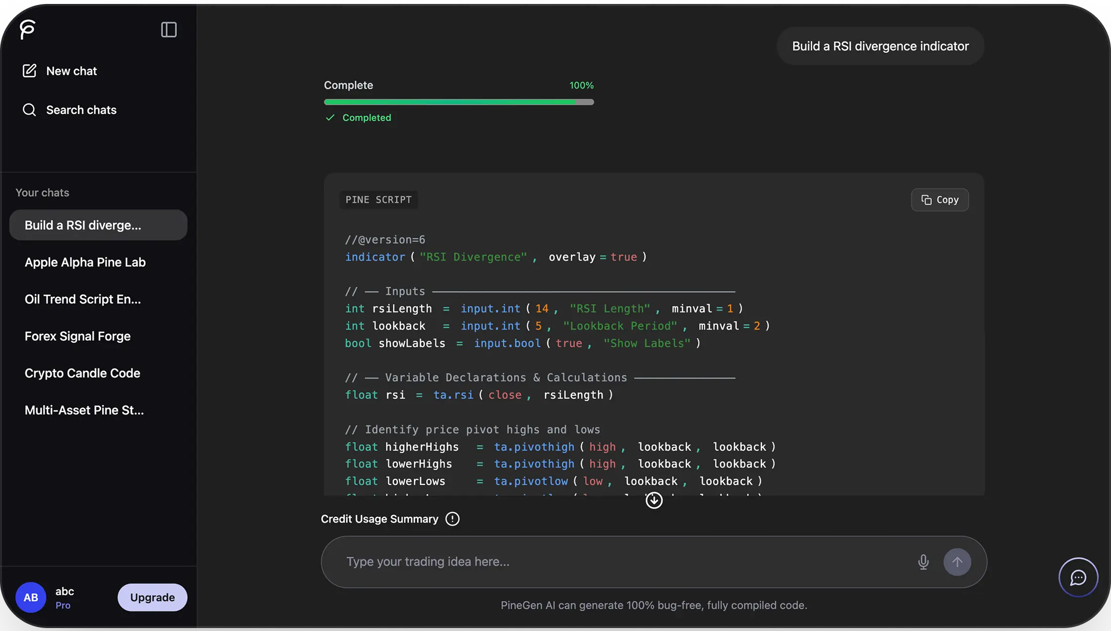 Generate, validate, and test Pine Script instantly. No waiting. No manual fixes.